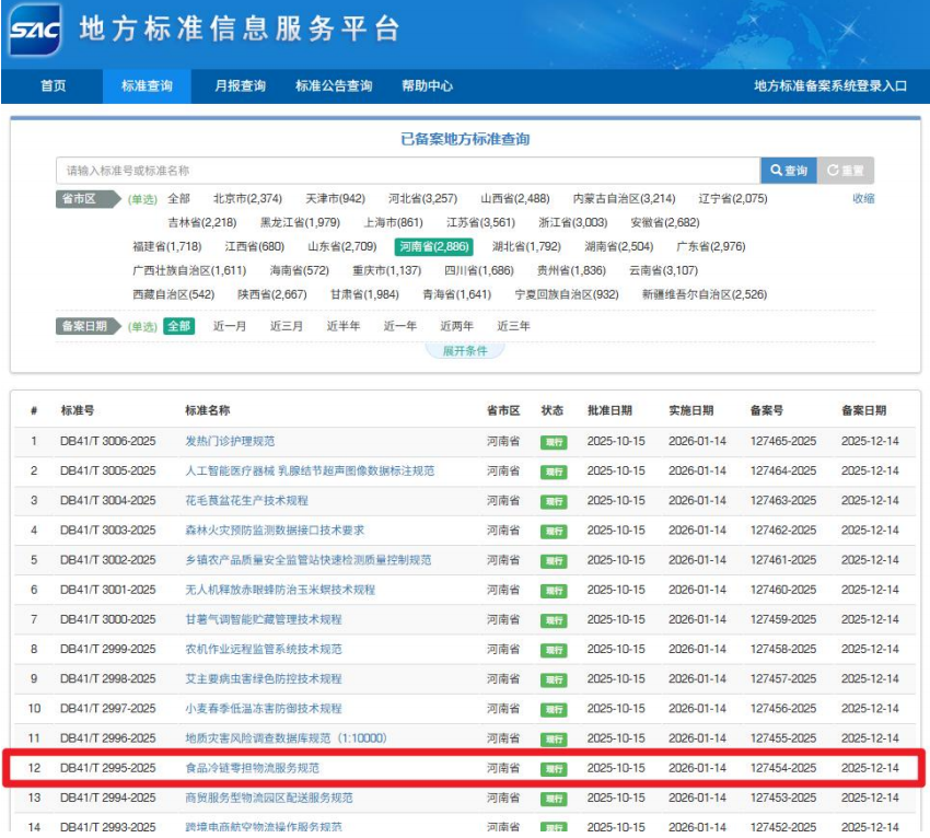 大河网讯 由华鼎冷链科技主导编制的河南省地方标准《食品冷链零担物流服务规范》(DB41/T 2995—2025)已在地方标准信息服务平台完成备案。将于2026年1月16日正式实施。此举填补了河南省在该领域省级地方标准的空白,为食品冷链零担物流服务的规范化、标准化发展提供了明确遵循。