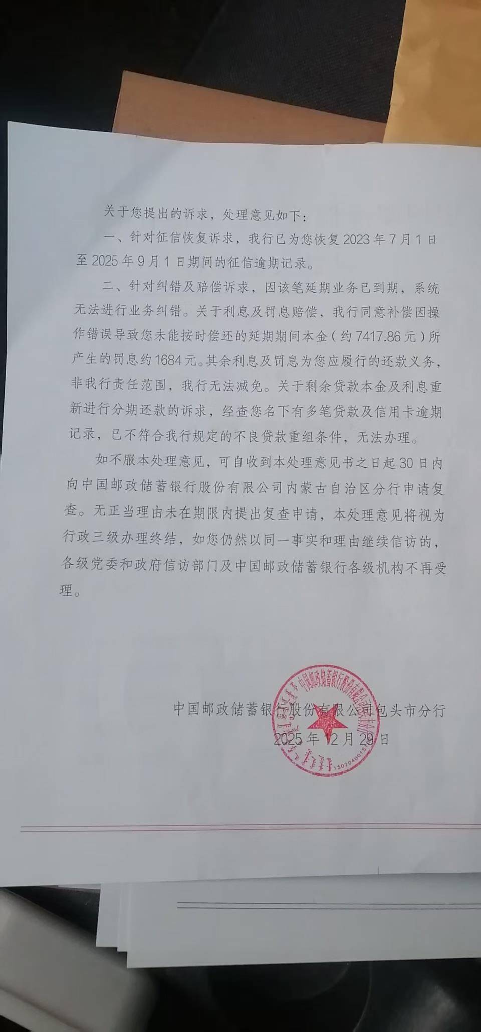 据报道,2015年9月,王小明为装修住房,在邮储银行包头市华丽家族支行办理了13万元个人综合消费贷款,期限10年共120期。2022年12月,因疫情过后有贷款延期纾困政策,王小明向银行申请“分摊式延期还款”,希望将2023年1月至6月共6期的还款额,平摊到剩余的26期内。但直到2023年7月他才得知,因经办人员操作失误,将“分摊式延期”误办为“延期6个月后一次性还清6期欠款”。当时经办人员已离职,对接的银行主管虽当场承认“是我们操作错了”,却只表示“会往上汇报纠错”,未给出具体解决时间。