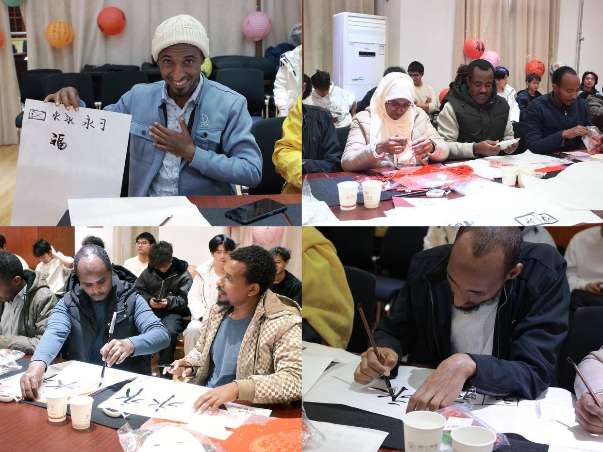 “祝你生日快乐!”吴建伟用英语向过生日的埃塞教师们送上真挚祝福,并代表学校赠送了象征中国传统文化与美好祝愿的“福”字。这份来自中国朋友的深情厚谊,让在场的埃塞教师们深受感动。生日会现场,中国结与红灯笼相映成趣,喜庆温馨的布置营造出浓厚的节日氛围。为了让外国友人能够更深入地体验中国文化,生日会特别安排了丰富的文化互动环节。埃塞俄比亚教师们兴致勃勃地尝试编织中国结、书写毛笔字,在郑州信息科技职业学院师生的耐心指导下,一件件象征友谊的作品在他们手中诞生。